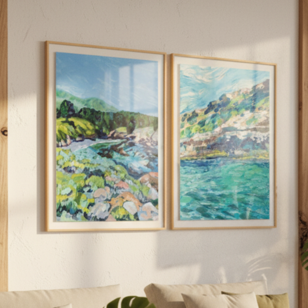 Con pinceladas audaces y colores vibrantes, esta pintura captura la tranquilidad de un día junto al mar, donde el agua cristalina se funde con colinas cubiertas de vegetación. La composición transmite frescura y serenidad, ideal para quienes buscan decorar con paisajes que invitan a respirar profundo y desconectarse. Va perfecto en espacios de descanso como el dormitorio, un estudio o la sala. 🐚🌞