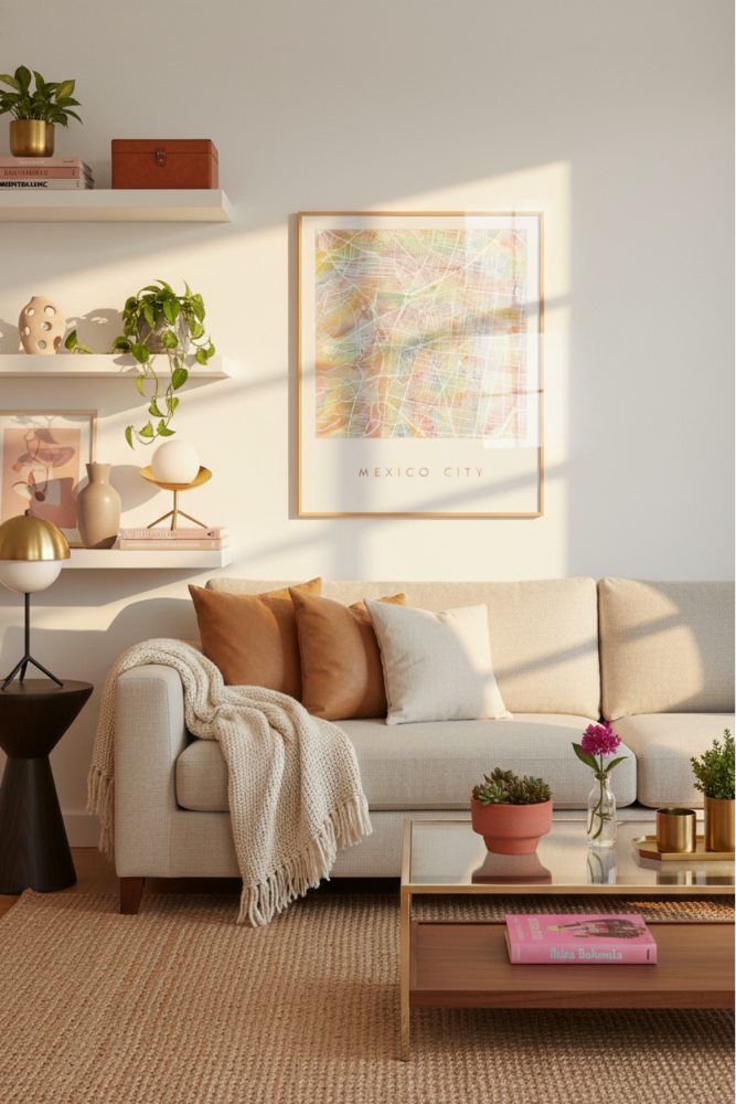 Con una mezcla de acuarelas cálidas en tonos melón, mostaza, verde olivo y coral, este mapa de la Ciudad de México transmite una sensación nostálgica y alegre a la vez. Las calles blancas resaltan sobre el fondo multicolor como un recuerdo emotivo del recorrido urbano. Ideal para espacios como home office o recámaras donde se busca conexión con la ciudad desde el arte. ☀️