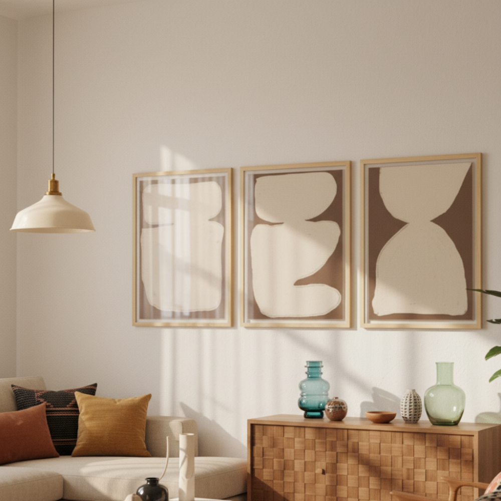 Con un fondo chocolate profundo y una forma crema que parece tallada con crayón, esta obra transmite calma y movimiento en equilibrio. La silueta curvada, casi escultórica, recuerda a una pieza de cerámica abstracta o a una figura amorfa flotando en silencio. Perfecta para dormitorios con estilo wabi-sabi, estudios con paleta neutra o salas modernas donde el arte sutil marca la diferencia. Hecha en ilustración digital con textura artesanal, es ideal para quienes buscan cuadros abstractos que sumen calidez y carácter sin saturar el espacio.