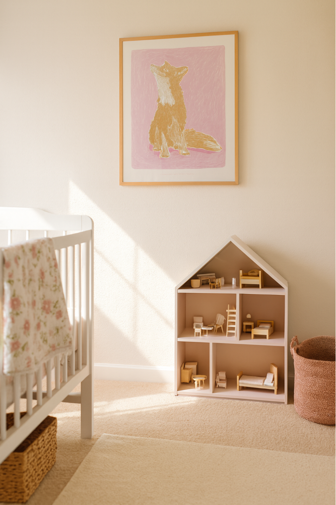 Una zorra color caramelo mira hacia arriba con dulzura y curiosidad, rodeada por un fondo lila que la hace resaltar como si estuviera iluminada por la luna 🌕🦊. El estilo crayon le da una textura encantadora, casi infantil, perfecta para sumar calidez y color a espacios como una habitación infantil, un pasillo creativo o un rincón lleno de plantas y libros.