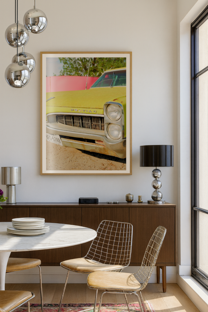 Un Pontiac clásico fotografiado con toda su esencia retro: carrocería amarilla desgastada, detalles cromados y una matrícula texana que lo conecta con la cultura de carretera. La composición resalta su carácter nostálgico y auténtico, con un toque vibrante gracias al fondo rosa. Ideal para quienes aman los íconos del diseño automotriz y la estética vintage.
