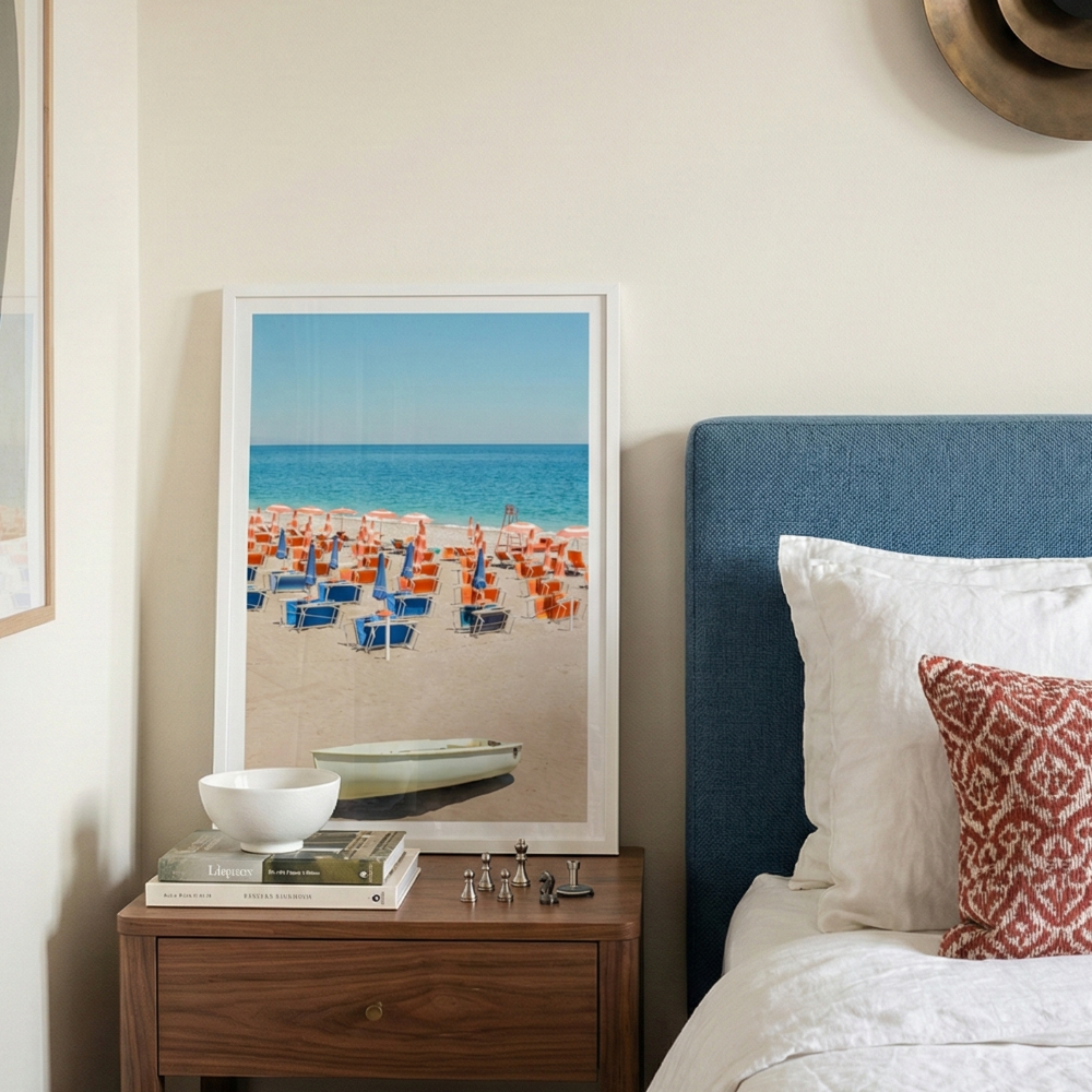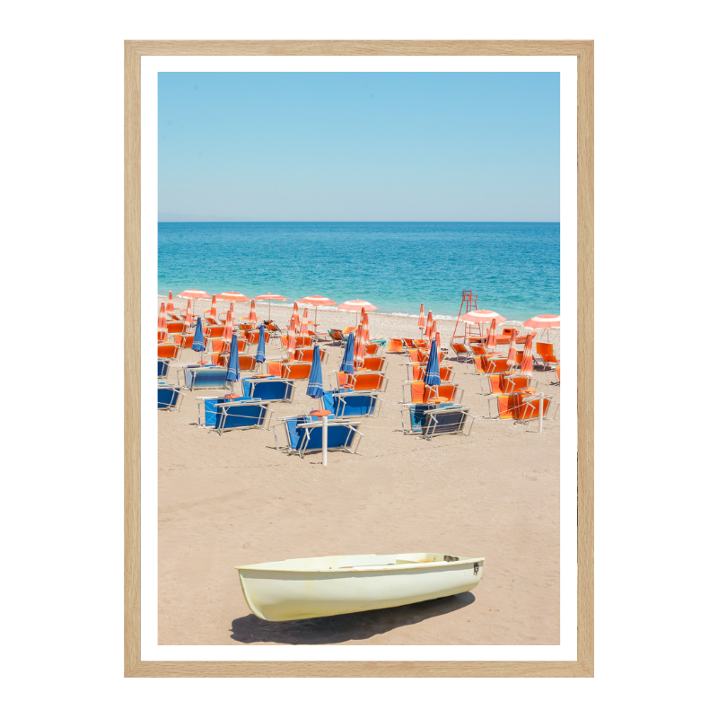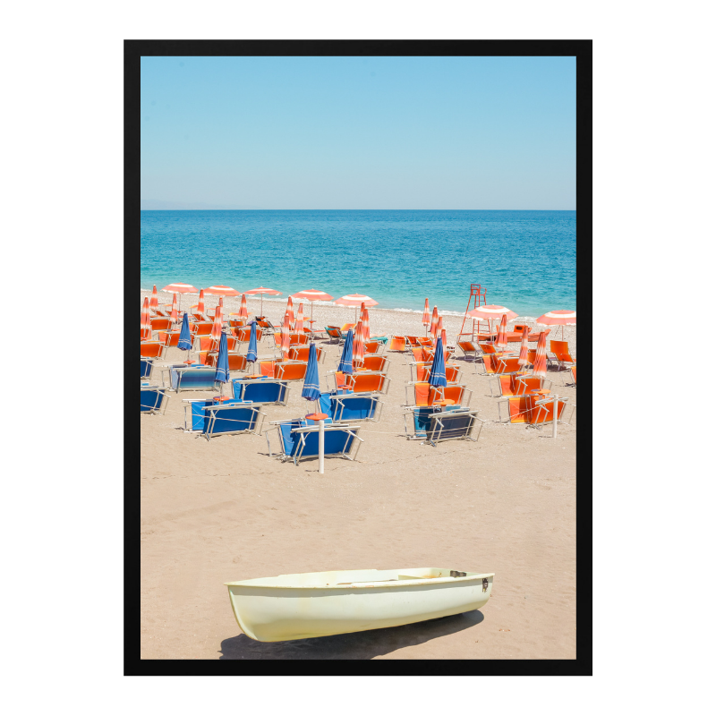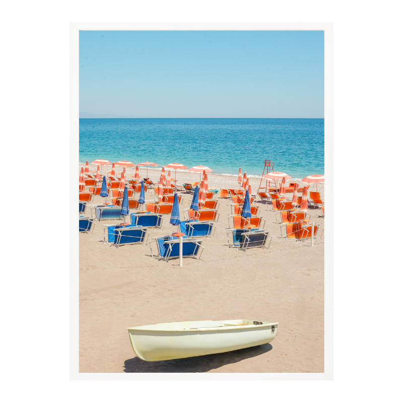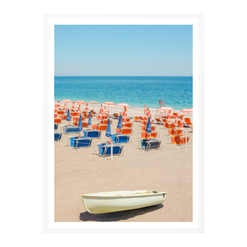 Fotografía tomada en la costa de Sicilia que retrata una playa mediterránea en plena calma, justo antes del movimiento del día. Las filas ordenadas de sombrillas y reposeras en tonos naranjas y azules crean un ritmo visual vibrante sobre la arena clara, mientras el mar profundo se extiende al fondo con una línea de horizonte limpia y serena. En primer plano, una pequeña lancha clara descansa sobre la arena, aportando un gesto cotidiano y auténtico que equilibra la composición. Una imagen luminosa, fresca y gráfica, ideal para transmitir verano, descanso y ese encanto simple de las playas italianas.