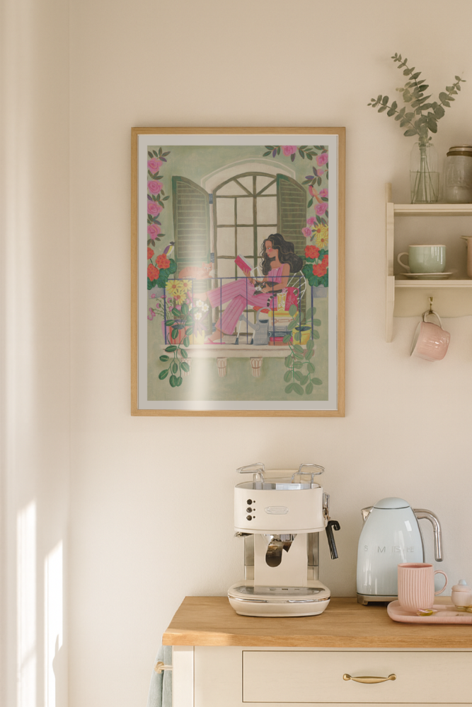 Este cuadro encantador refleja un momento íntimo y relajado: una mujer en pijama rosa disfruta de la lectura en su balcón rodeada de flores, plantas y sus dos gatos. Los tonos suaves y la abundancia de detalles —como los maceteros, los libros y las persianas verdes— crean una escena cálida y hogareña que invita a disfrutar los pequeños placeres de la vida. Ideal para decorar la sala, el dormitorio o cualquier espacio donde reine la calma y la belleza cotidiana. 🐈📖