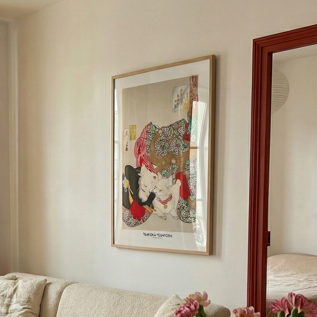 Este cuadro de arte japonés estilo ukiyo-e de Tsukioka Yoshitoshi retrata a una mujer con peinado tradicional y kimono lleno de patrones geométricos, inclinándose con ternura hacia un gato blanco con collar rojo y detalle dorado. La escena combina líneas finas con bloques de color y textiles súper detallados: rojos intensos, verde esmeralda, morado, azul y beige, creando un look elegante y vibrante a la vez, perfecto para quienes buscan cuadros de retratos japoneses, animales (gatos), diseño de kimonos, arte oriental vintage y decoración con acentos de color. 🐈⬛✨