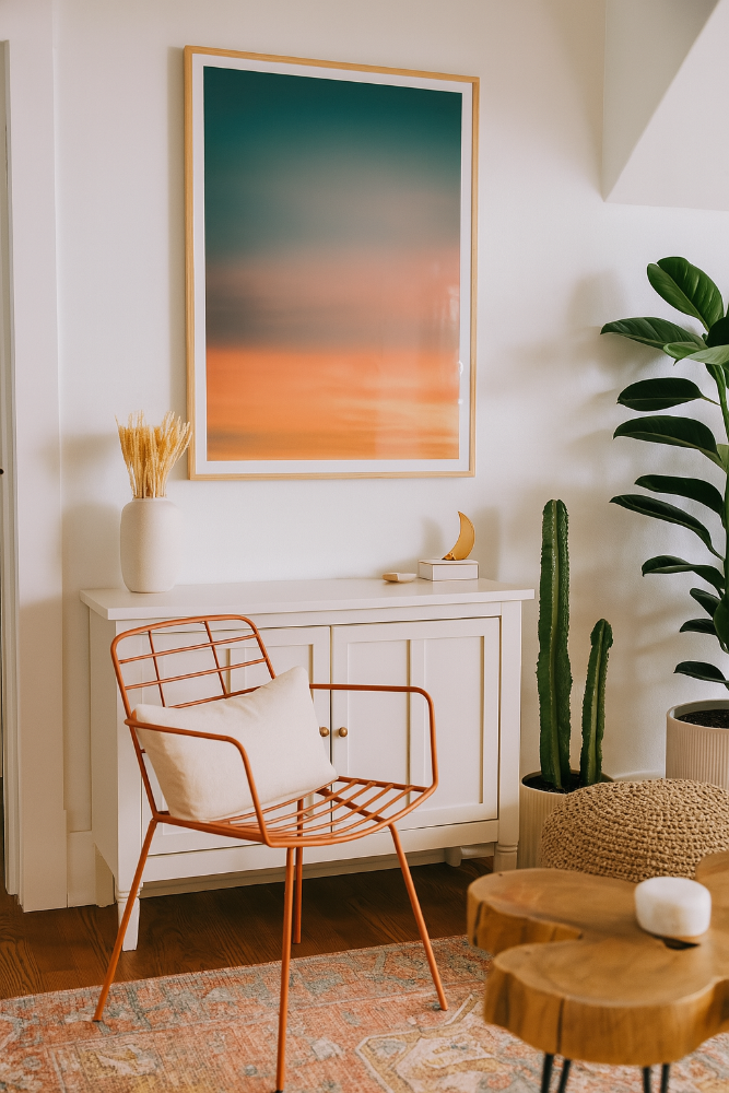 Esta fotografía minimalista captura un instante mágico: el cielo fundiéndose en un degradado perfecto entre turquesa profundo y cálidos tonos anaranjados. Su estilo suave y envolvente llena cualquier espacio de serenidad y color, ideal para dormitorios, estudios creativos o salas con decoración moderna. Esta obra transmite la belleza de los momentos más simples, y su enfoque cromático la convierte en una pieza clave para una decoración armoniosa. 🎨