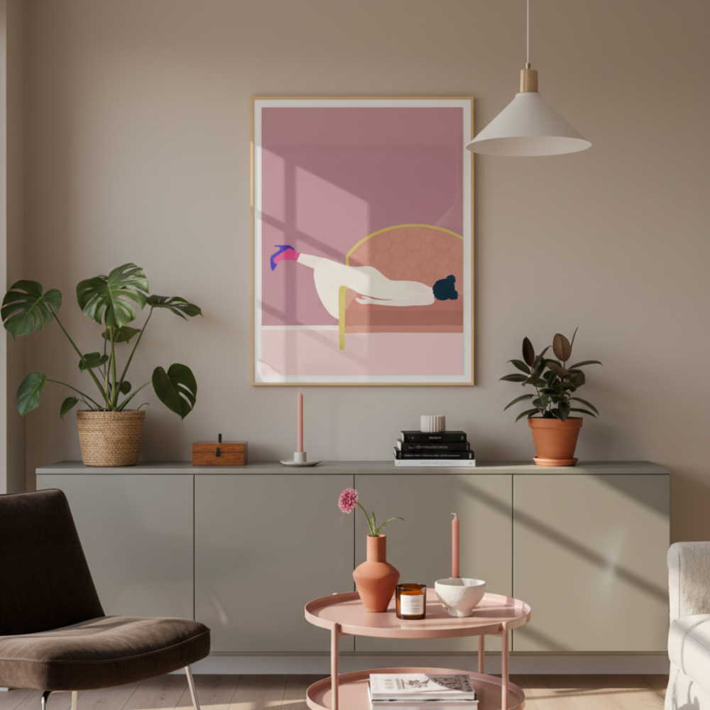 Esta ilustración divertida y delicada muestra a una mujer recostada boca abajo sobre un sofá vintage en tonos rosa empolvado, con tacones morados y calcetas rosas que le dan un toque juguetón al conjunto. El fondo monocromático en tonos rosados y el vestido claro con pequeños puntos acentúan la estética femenina y sofisticada de la escena. Ideal para salas o rincones personales con una vibra relajada y estética contemporánea. 💗🛋️