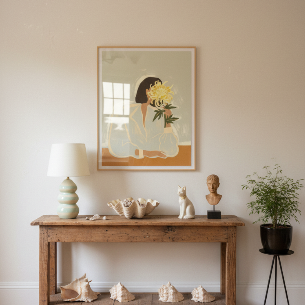 Esta ilustración transmite una delicada mezcla de serenidad y elegancia, mostrando a una figura femenina ocultando parcialmente su rostro detrás de una flor amarilla vibrante, que sostiene con gracia. El contraste entre los tonos suaves del fondo y la luminosidad de la flor crea una composición armónica y equilibrada. La blusa fluida y las líneas sutiles aportan un aire etéreo y relajado, mientras que la paleta de colores cálidos y pasteles añade una sensación de calidez y naturalidad. Es una pieza ideal para espacios que buscan un toque artístico y minimalista lleno de frescura y encanto