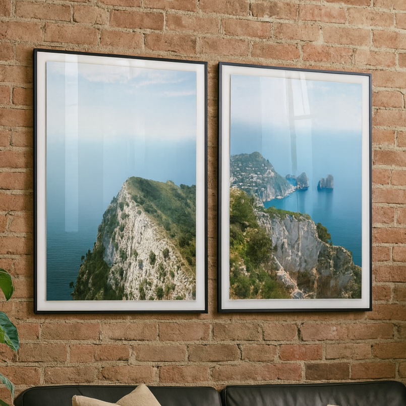 Este set de fotografías presenta impresionantes vistas panorámicas de una costa montañosa junto al mar. La primera imagen muestra una cresta rocosa que se extiende hacia el horizonte, destacando el contraste entre las verdes colinas y el vasto océano azul. La segunda imagen presenta un paisaje costero con imponentes acantilados y las famosas formaciones rocosas en el mar la costa de Capri. Este conjunto captura la esencia de la belleza natural de los paisajes mediterráneos y es ideal para quienes buscan un toque de naturaleza y serenidad en su decoración.