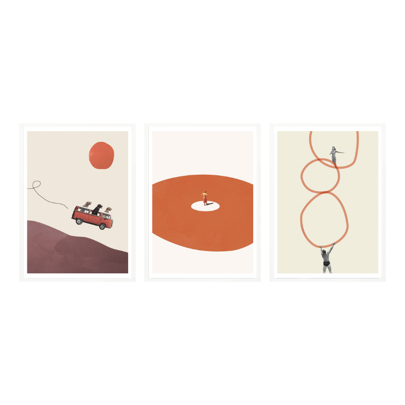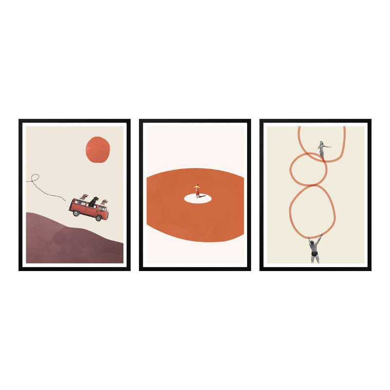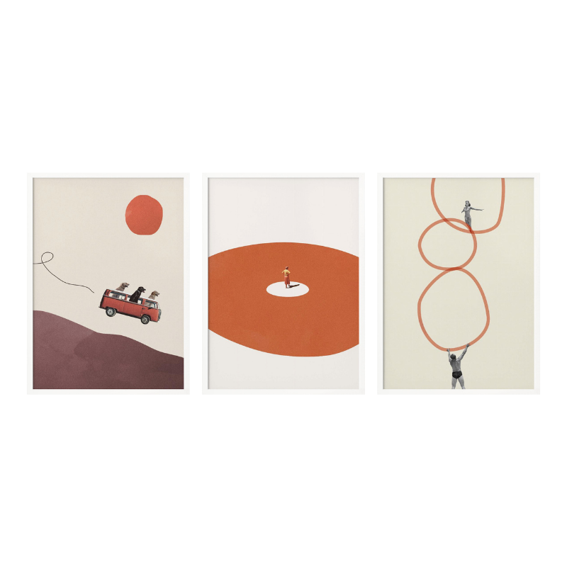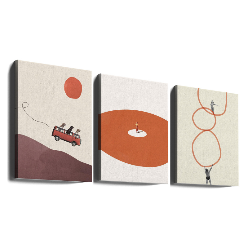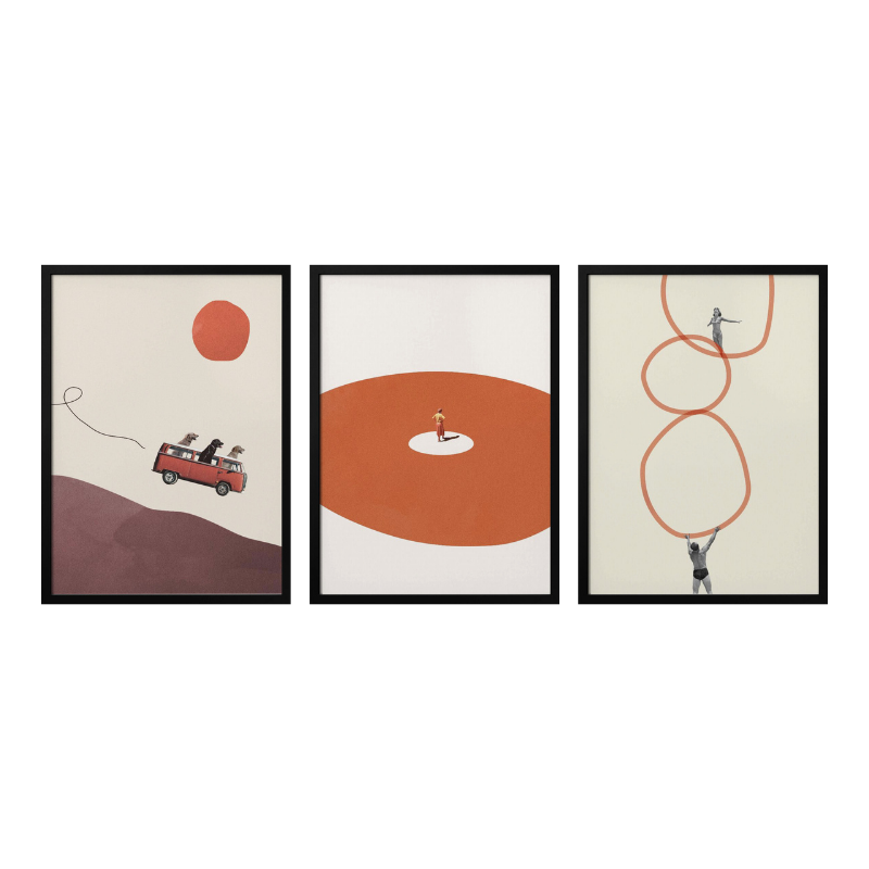 Este set de cuadros mezcla lo surreal y lo lúdico en tres escenas llenas de imaginación: un viaje en combi por colinas coloridas, una figura diminuta en un gran espacio circular y un par de personajes jugando con líneas que se transforman en lazos gigantes. 🎈 Su estilo contemporáneo con toques de collage y paleta en tonos terracota, beige y rojo los convierte en piezas ideales para espacios creativos, pasillos modernos, salas con personalidad o estudios llenos de inspiración. 🌞