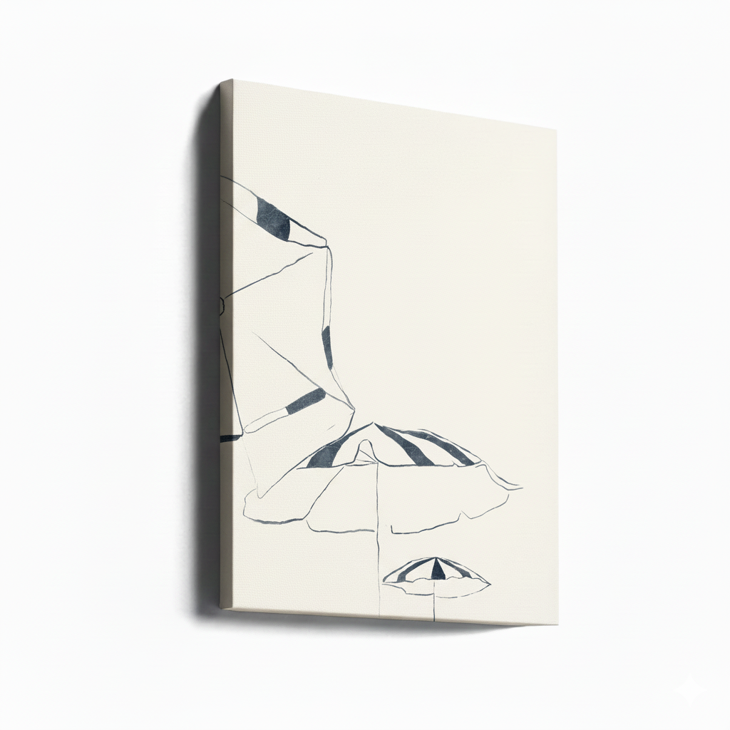 Con un trazo tan simple como evocador, este cuadro en azul tinta y blanco nos transporta directo a un día de playa. Las sombrillas rayadas y la línea de la montaña capturan esa calma que se siente bajo el sol, con brisa suave y sal en el aire. Es una obra que respira minimalismo costero, perfecta para darle un toque sereno y veraniego a tu hogar —ya sea en el baño, un pasillo o tu rincón favorito del descanso.