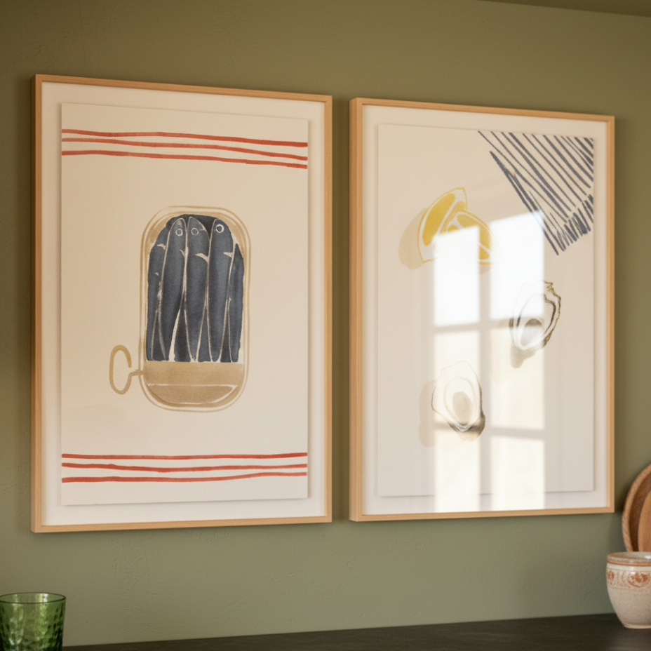 Este conjunto de ilustraciones minimalistas representa sardinas enlatadas en una imagen y ostras con rodajas de limón en la otra. Los trazos son simples y suaves, con una paleta de colores claros y naturales que incluyen azul marino, gris y amarillo. Las líneas horizontales rojas en la imagen de las sardinas y el detalle del paño azul en la imagen de las ostras añaden un toque náutico, evocando la frescura del mar. Estas piezas serían ideales para decorar un espacio de cocina o comedor, aportando un estilo marítimo y fresco.