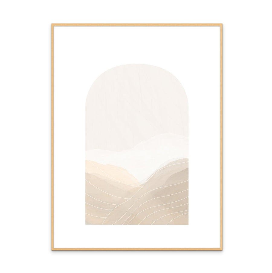 Este diseño minimalista utiliza tonos neutros y suaves para representar un paisaje abstracto, creando una atmósfera tranquila y relajante. Las capas de montañas en colores beige y blanco se complementan con líneas onduladas delicadas que añaden textura y profundidad sin sobrecargar la composición. El arco que enmarca el diseño aporta un toque moderno y sofisticado, ideal para espacios que buscan una decoración discreta pero elegante. Es perfecto para interiores con estilos escandinavos, bohemios o naturales, donde la sutileza y la calma son esenciales.