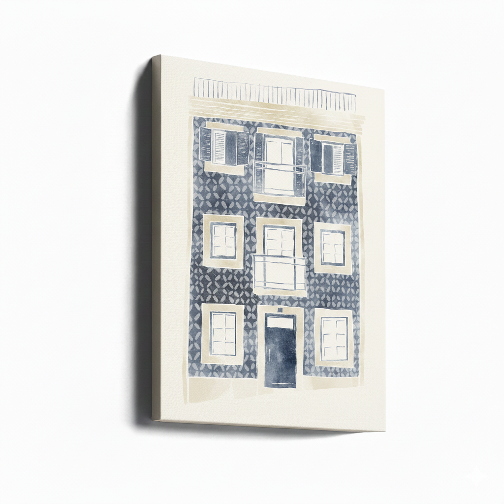 Este cuadro representa un edificio típico del sur de Europa con azulejos en azul marino y ventanas simétricas, capturado con un estilo acuarelado lleno de encanto. Cada trazo evoca la calidez de las calles lisboetas, los balcones con flores y la vida que pasa lenta entre sus paredes. Es ideal para comedores, cocinas o pasillos con estilo mediterráneo o bohemio. Una pieza que transmite cultura, historia y diseño en una sola mirada. 🏠🇵🇹