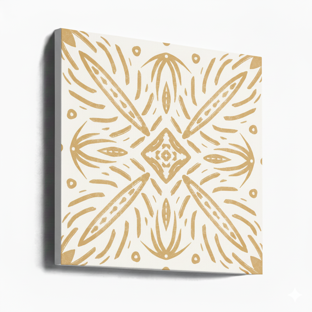 Este cuadro cuadrado en tonos mostaza juega con formas tribales y orgánicas dispuestas en simetría perfecta, evocando la estética de los azulejos artesanales. Con un aire luminoso y lleno de ritmo visual, esta pieza es ideal para dar un toque cálido y desenfadado a cualquier rincón del hogar, desde cocinas hasta terrazas interiores o comedores eclécticos. ☀️🌿