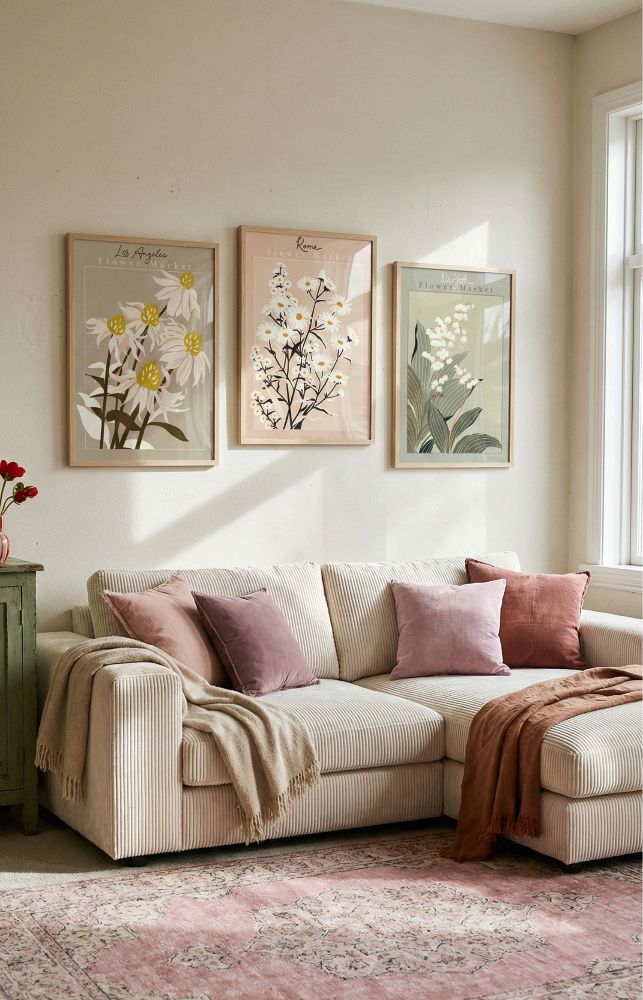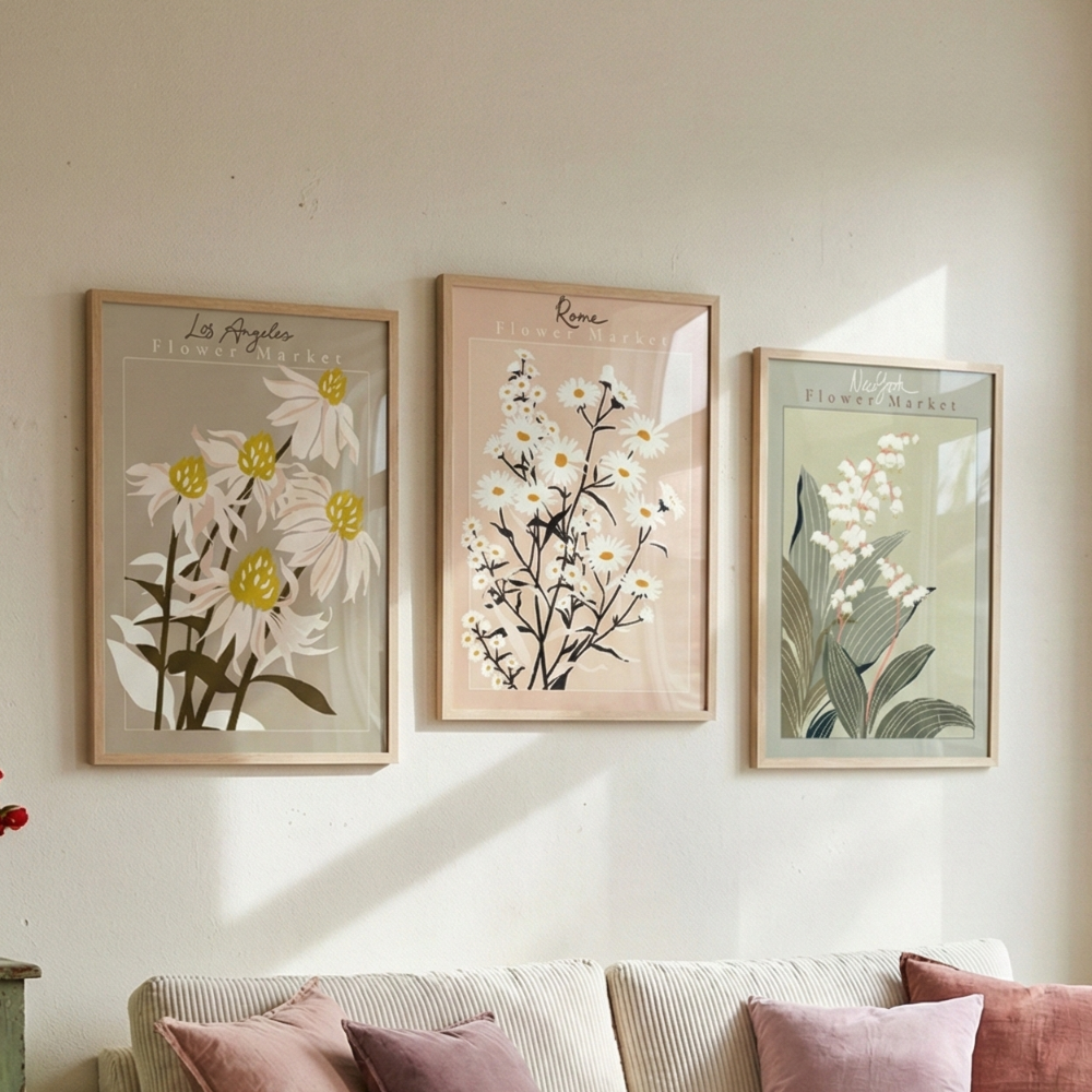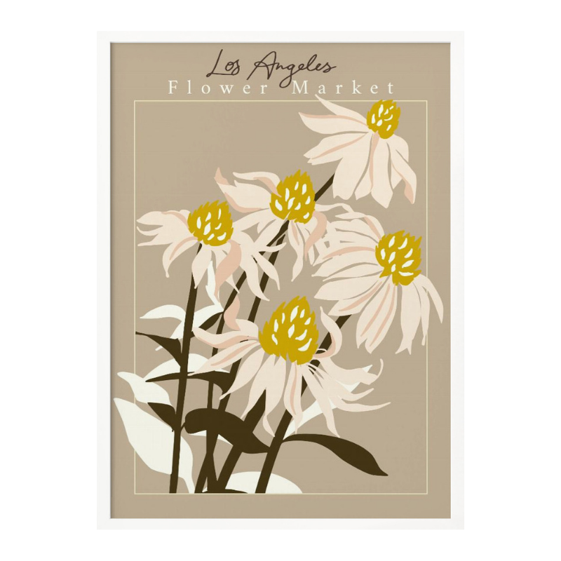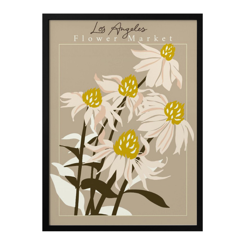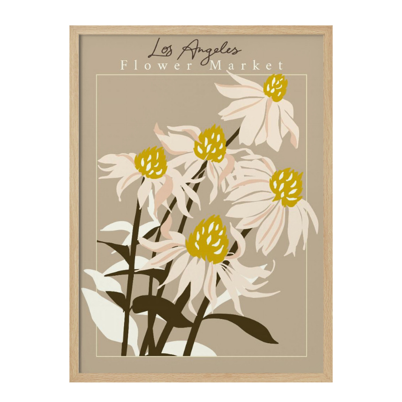 Este cuadro floral inspirado en Los Angeles Flower Market combina ilustración botánica con una paleta suave y cálida que transmite serenidad y equilibrio. Las flores de pétalos claros y centros dorados se despliegan con un trazo delicado sobre un fondo beige, creando una composición armoniosa, luminosa y atemporal. Es una pieza que aporta frescura visual y un aire elegante, ideal para quienes buscan sumar naturaleza, calma y un toque sofisticado a su decoración.