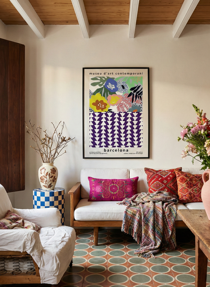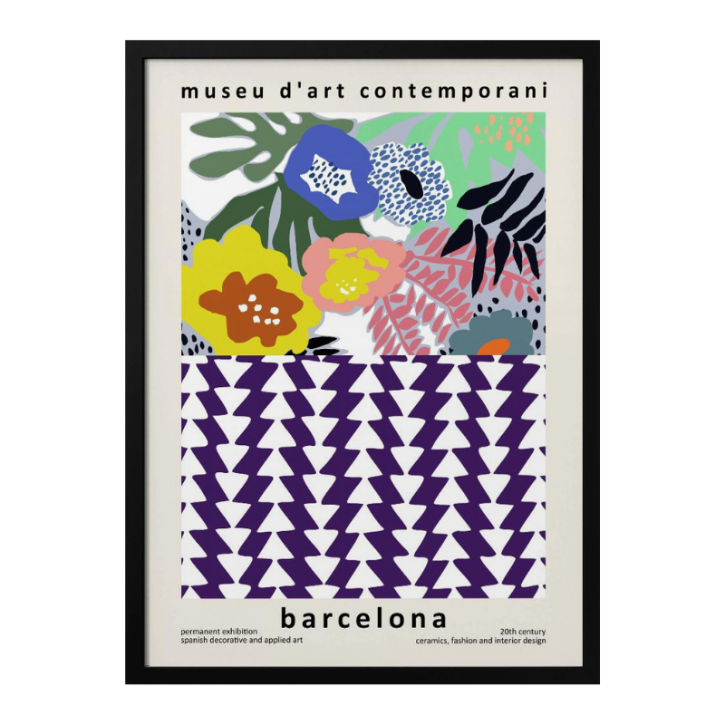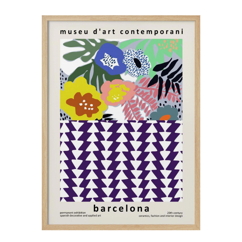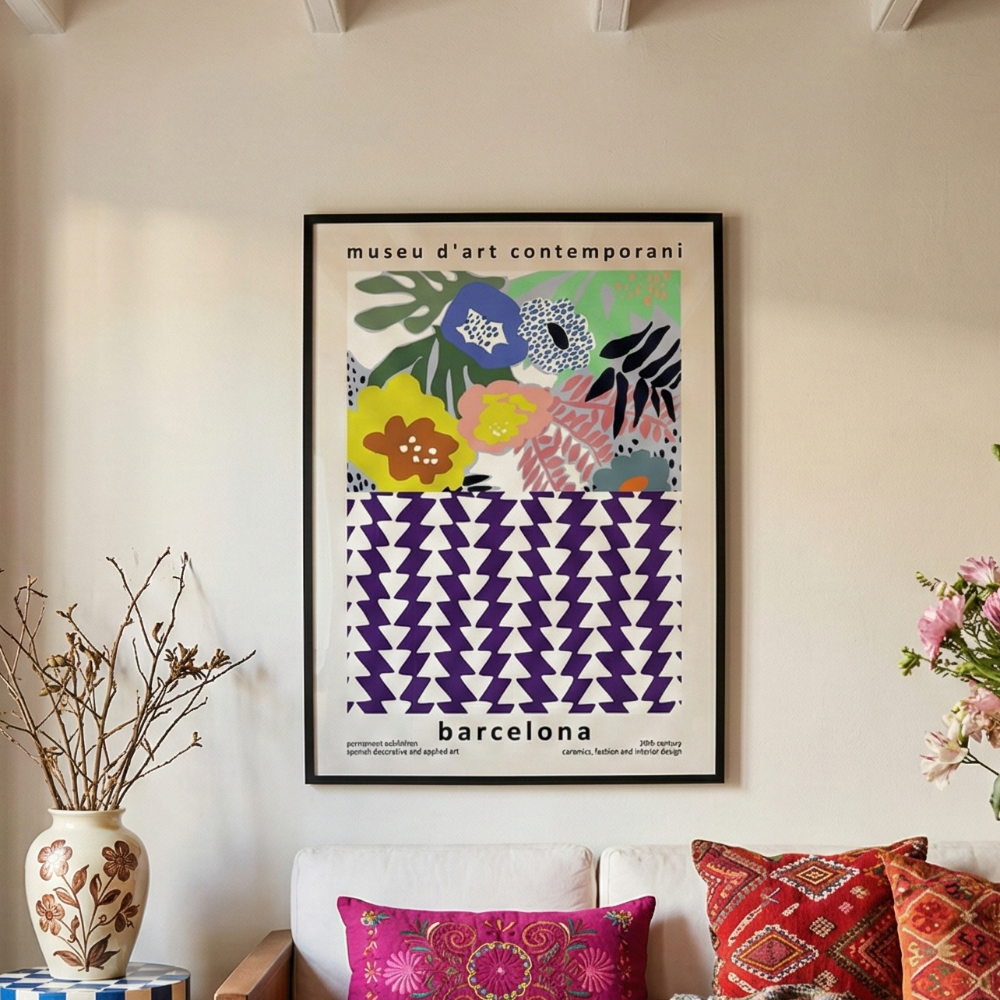 Este cuadro combina ilustración moderna y patrones gráficos en una composición vibrante y equilibrada. En la parte superior, flores y follaje estilizados en tonos verdes, azules, rosas, amarillos y negros aportan un aire orgánico y fresco, mientras que la base geométrica en morado profundo crea un contraste visual fuerte y rítmico. La pieza dialoga entre lo botánico y lo abstracto, evocando el diseño contemporáneo europeo con una clara inspiración mediterránea, donde el color, la forma y el patrón conviven con naturalidad y carácter artístico. 🌿💜