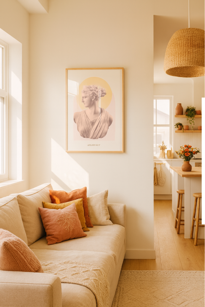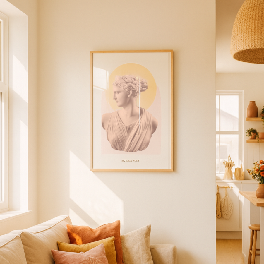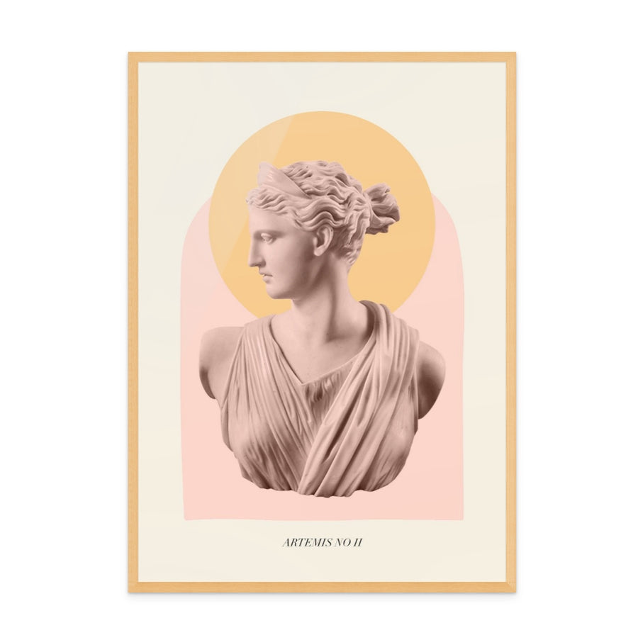 Esta ilustración presenta un busto clásico de Artemisa, la diosa griega de la caza, la naturaleza y la luna, retratado con un toque contemporáneo. La escultura de estilo clásico está rodeada por formas geométricas modernas: un círculo en tonos cálidos de naranja detrás de la cabeza de la diosa, creando un halo estilizado que resalta su figura. El fondo pastel beige y rosa añade suavidad y modernidad, contrastando con la textura detallada del mármol de la escultura. Esta obra tiene un equilibrio entre lo antiguo y lo moderno, ideal para espacios minimalistas o contemporáneos que buscan un toque de historia clásica en su decoración.