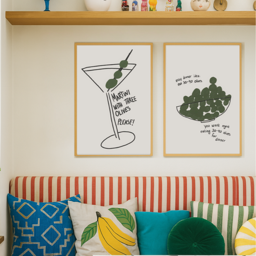 Este diseño minimalista y moderno muestra una copa de martini ilustrada con líneas simples, adornada con tres aceitunas verdes en un palillo. Acompañado del texto "Martini with three olives, please!", el diseño transmite un aire sofisticado y divertido. Perfecto para decorar bares en casa, cocinas o espacios sociales, este cuadro añade un toque elegante y juguetón al ambiente, ideal para quienes disfrutan del estilo clásico con un giro contemporáneo. Su simplicidad lo hace versátil y fácil de combinar con diferentes decoraciones.