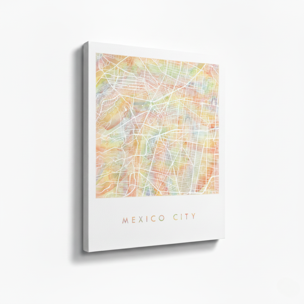 Con una mezcla de acuarelas cálidas en tonos melón, mostaza, verde olivo y coral, este mapa de la Ciudad de México transmite una sensación nostálgica y alegre a la vez. Las calles blancas resaltan sobre el fondo multicolor como un recuerdo emotivo del recorrido urbano. Ideal para espacios como home office o recámaras donde se busca conexión con la ciudad desde el arte. ☀️