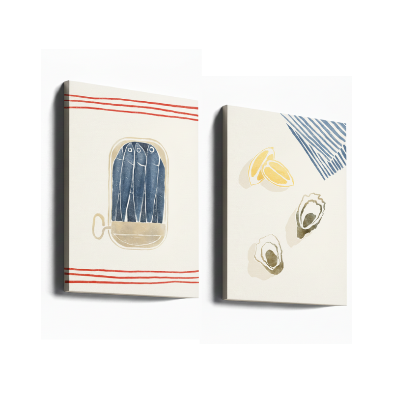 Este conjunto de ilustraciones minimalistas representa sardinas enlatadas en una imagen y ostras con rodajas de limón en la otra. Los trazos son simples y suaves, con una paleta de colores claros y naturales que incluyen azul marino, gris y amarillo. Las líneas horizontales rojas en la imagen de las sardinas y el detalle del paño azul en la imagen de las ostras añaden un toque náutico, evocando la frescura del mar. Estas piezas serían ideales para decorar un espacio de cocina o comedor, aportando un estilo marítimo y fresco.