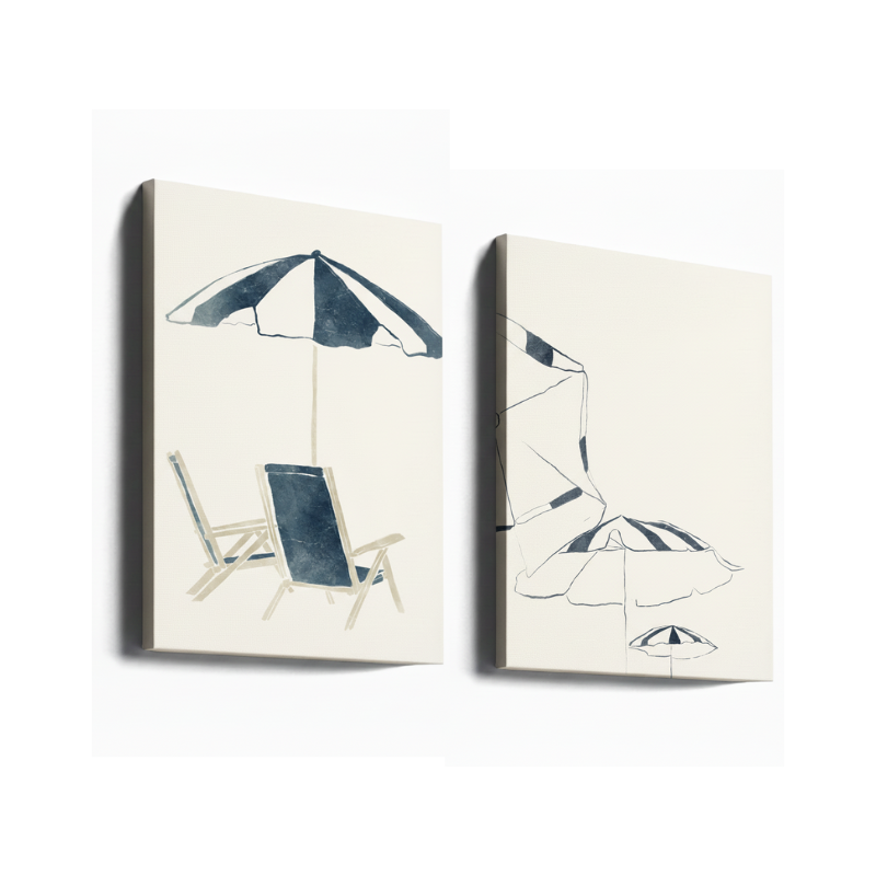 Este set de cuadros presenta una escena costera minimalista con sombrillas y sillas de playa en tonos azul marino y beige sobre un fondo claro. En el primer cuadro, se destacan dos sillas reclinables bajo una sombrilla rayada, evocando una atmósfera relajada y veraniega. El segundo cuadro ofrece una composición más abstracta, mostrando partes de sombrillas y otros elementos de playa en un trazo más esquemático y sutil. El conjunto transmite una sensación de calma y vacaciones, ideal para decorar espacios que busquen una atmósfera fresca y tranquila, inspirada en la vida junto al mar.