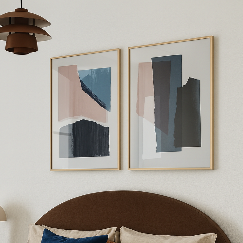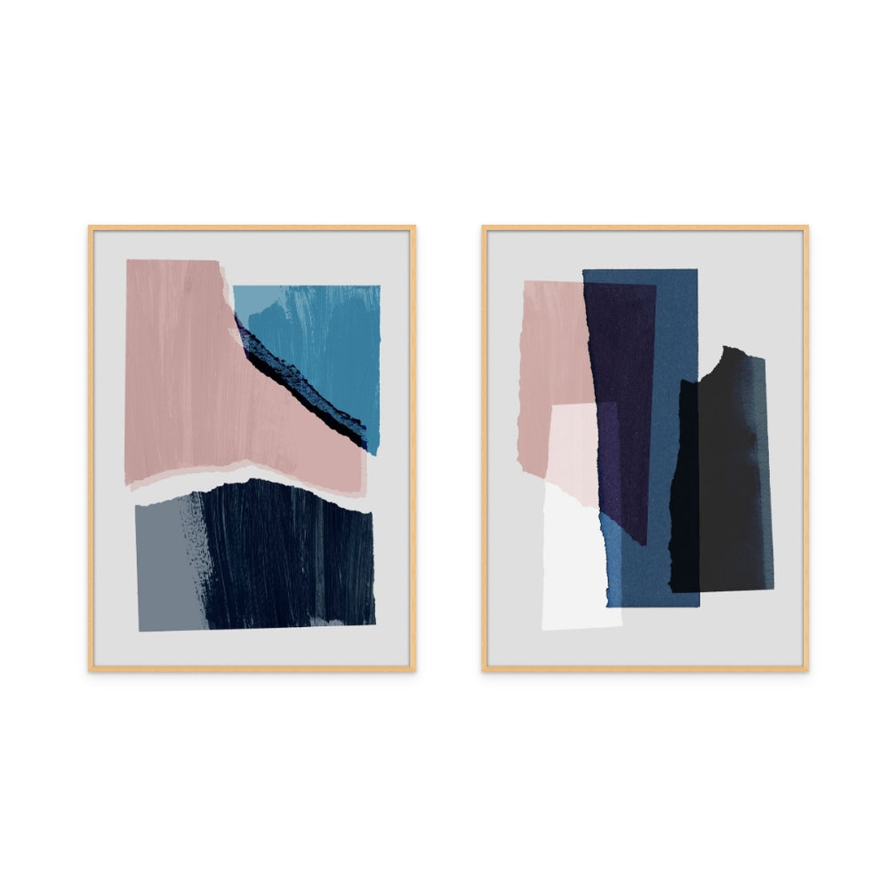 Este set de cuadros presenta un diseño abstracto compuesto por bloques de color en tonos neutros y fríos, como azul, gris, negro y rosa pálido. Las formas geométricas superpuestas y las texturas suaves crean una sensación de equilibrio y profundidad. Es ideal para espacios minimalistas y modernos que buscan añadir un toque artístico sin sobrecargar el ambiente.