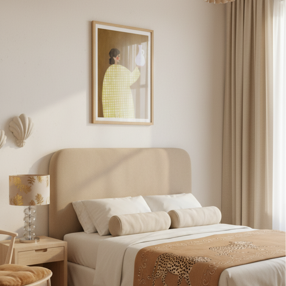 Esta encantadora ilustración presenta a una figura femenina sosteniendo una jarra blanca, destacada por su simplicidad y estilo moderno. El contraste entre el atuendo de cuadros amarillos y blancos y el fondo en tonos tierra le da un aire cálido y acogedor. La expresión serena de la figura y la sutileza de los colores hacen de esta pieza una opción perfecta para quienes buscan una obra que transmita calma y elegancia en su hogar o espacio personal. Ideal para complementar una decoración moderna con un toque artístico único.